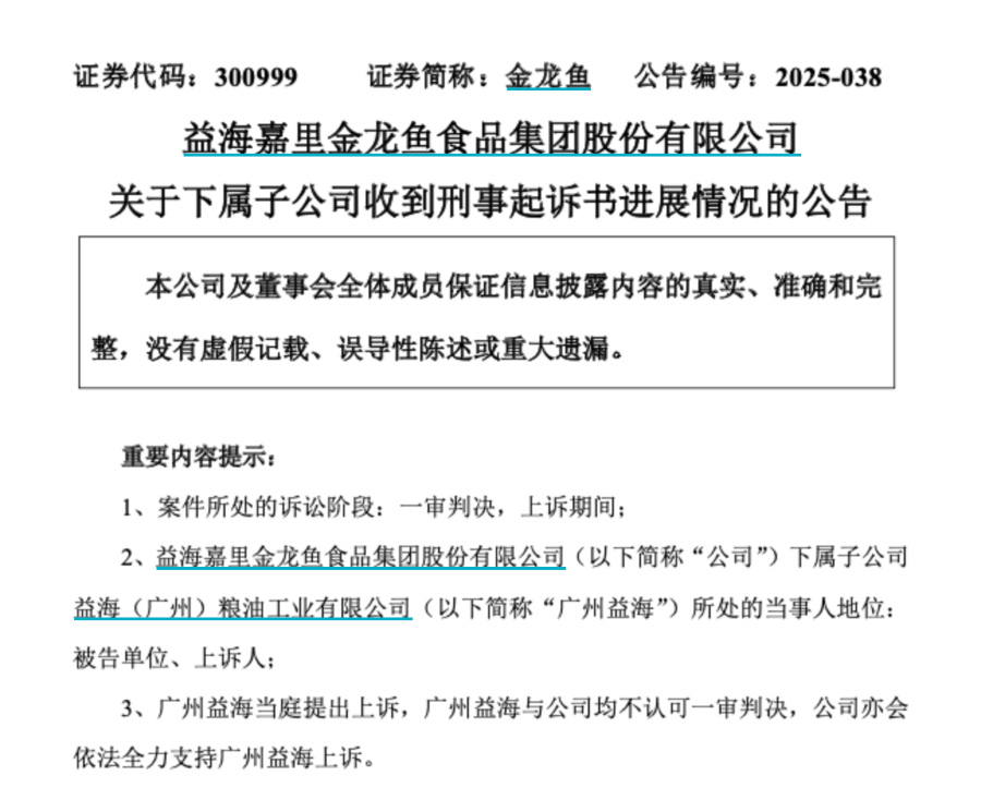 子公司被判合同詐騙罪 金龍魚發(fā)表聲明:已上訴