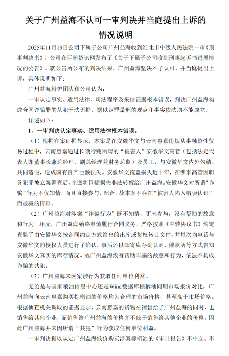 據(jù)21世紀經(jīng)濟報道記者掌握的一份金龍魚《關(guān)于廣州益海不認可一審判決并當庭提出上訴的情況說明》(以下簡稱《情況說明》)顯示,廣州益海辯護團隊和公司認為:一審認定事實、適用法律、司法程序及采信證據(jù)根本錯誤,判決廣州益海構(gòu)成合同詐騙罪的從犯于法無據(jù),據(jù)以定罪量刑的觀點和事實依法均不能成立。