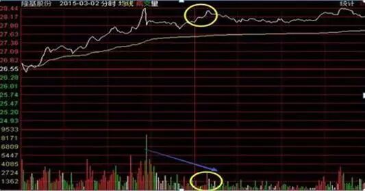 4、放量滯漲的分時圖,重點(diǎn)表現(xiàn)在股價快速拉升,均價線沒有跟上去,分時圖產(chǎn)生乖離,而分時量又放量縮減,這時候要注意賣出,更要謹(jǐn)防分時追高的風(fēng)險。