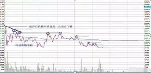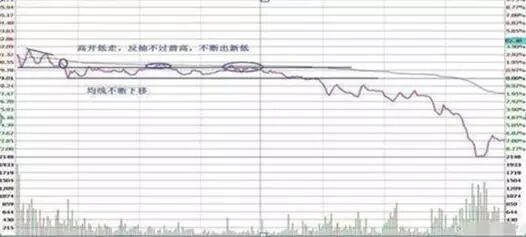 低開后反抽不過前高且高點(diǎn)下移,均線跟下