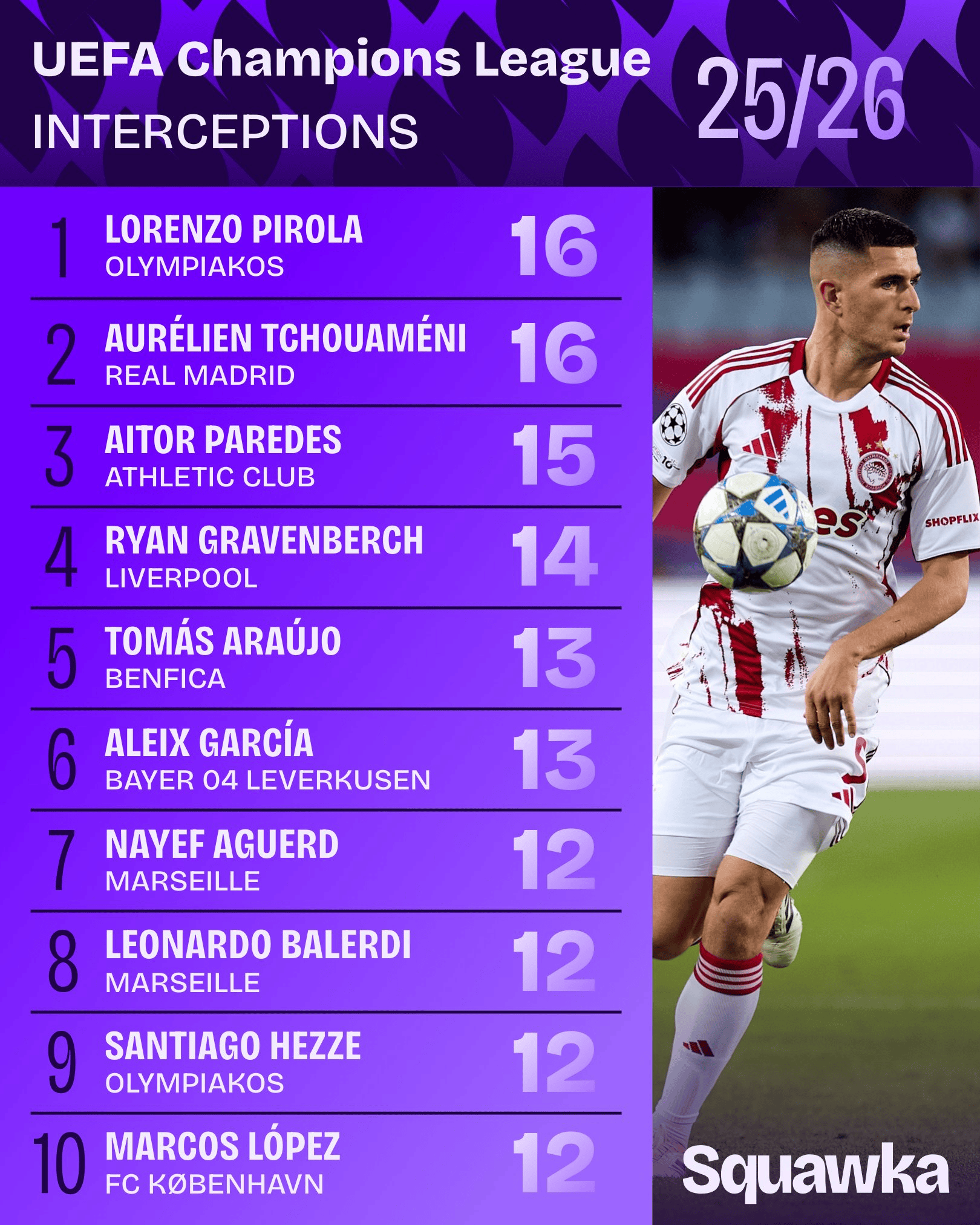 [流言板]本賽季歐冠攔截榜:皮羅拉、瓊阿梅尼16次并列居首