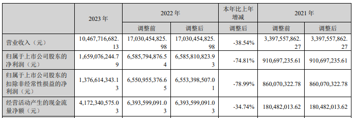 2023年,天華新能營業(yè)收入為104.68億元,同比下降38.54%;歸屬于上市公司股東的凈利潤16.59億元,同比下降74.81%;歸屬于上市公司股東的扣除非經(jīng)常性損益的凈利潤13.77億元,同比下降78.99%;經(jīng)營活動產(chǎn)生的現(xiàn)金流量凈額41.72億元,同比下降34.74%。