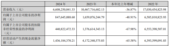 2024年,天華新能營業(yè)收入為66.08億元,同比下降36.87%;歸屬于上市公司股東的凈利潤8.48億元,同比下降48.91%;歸屬于上市公司股東的扣除非經(jīng)常性損益的凈利潤4.41億元,同比下降67.98%;經(jīng)營活動產(chǎn)生的現(xiàn)金流量凈額14.36億元,同比下降65.58%。
