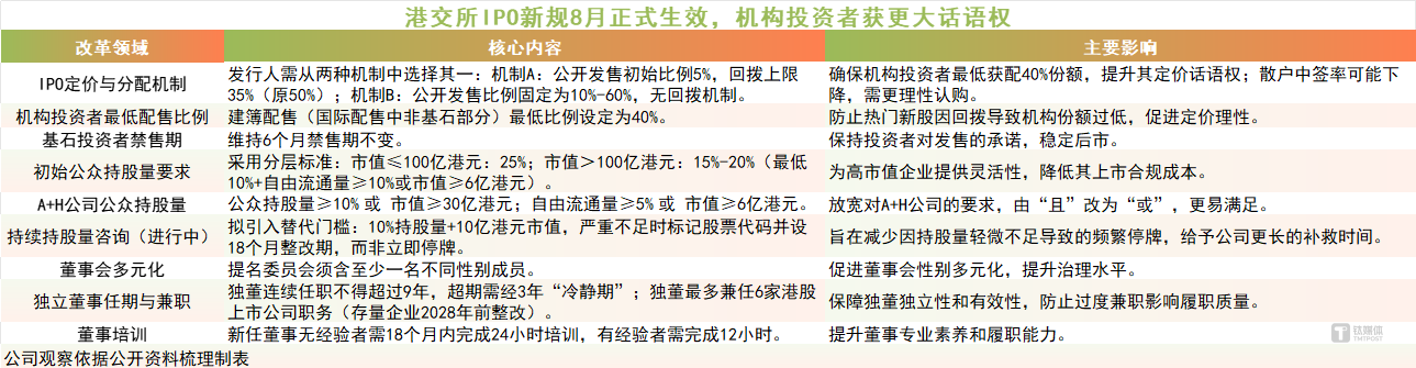 今年8月初,港交所正式實(shí)施的優(yōu)化后的IPO市場新規(guī),也特別強(qiáng)調(diào)了“提升機(jī)構(gòu)投資者在IPO定價(jià)中的話語權(quán)”,確保定價(jià)合理性及后市穩(wěn)定。新規(guī)主要涉及配售比例調(diào)整、回?fù)軝C(jī)制優(yōu)化及公眾持股要求修訂,被視為港交所自上世紀(jì)90年代以來對IPO制度的最大調(diào)整。