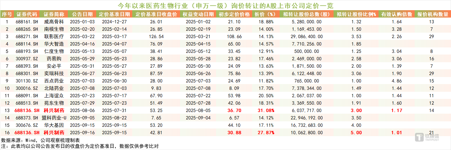 再看今年以來,A股醫(yī)藥生物行業(yè)(申萬一級)已發(fā)生的16起詢價(jià)轉(zhuǎn)讓案例。