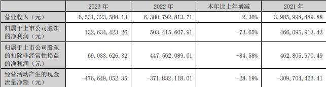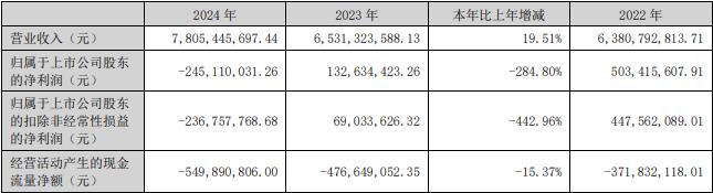 據(jù)公司2024年年報,報告期內(nèi),公司實現(xiàn)營業(yè)收入78.05億元,同比增長19.51%;實現(xiàn)歸屬于上市公司股東的凈利潤-2.45億元,上年為1.33億元;實現(xiàn)歸屬于上市公司股東的扣除非經(jīng)常性損益的凈利潤-2.37億元,上年為6903.36萬元;經(jīng)營活動產(chǎn)生的現(xiàn)金流量凈額為-5.50億元,2023年為-4.77億元,2022年為-3.72億元,2021年為-3.10億元。