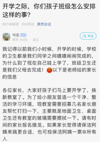 “為什么還是掃教室學(xué)我們?”開學(xué)了,學(xué)校教室需要打掃,校該老師讓家長報名“代勞”,打破引發(fā)吐槽。潛規(guī)則